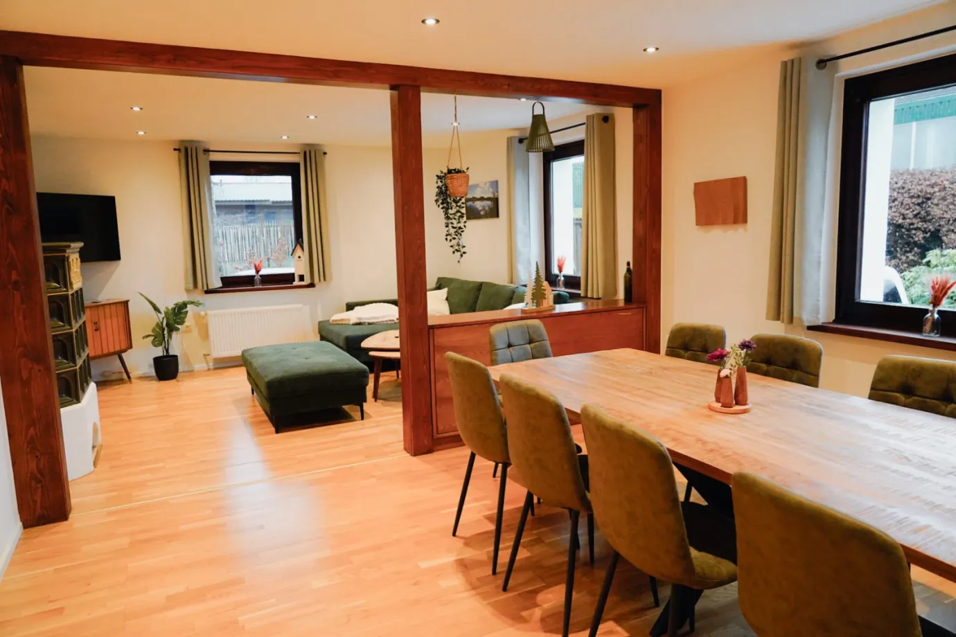 Der weitläufige Wohn- und Essbereich bildet das Herz des Hauses – ein Ort, an dem man gemeinsam kocht, lacht und den Tag ausklingen lässt.